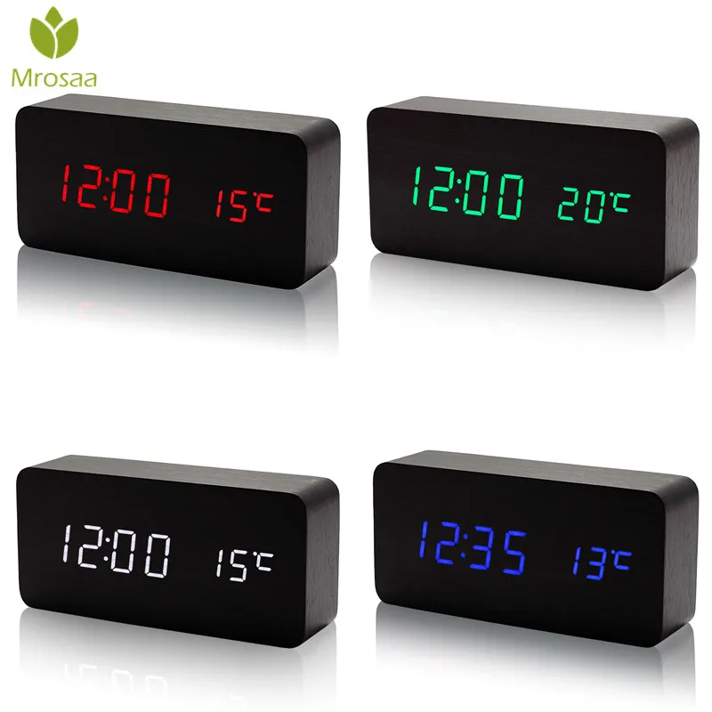 Electronic LED Digital Alarm Clock Temperature Sounds Control Wooden Table clock Calendar Display D